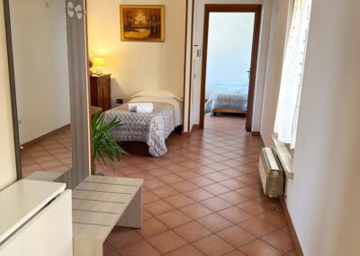 Proseguendo verso il fondo della camera si accede alla stanza da letto principale, dotata di letto matrimoniale divisibile su richiesta in due letti singoli e di un ulteriore letto singolo, offrendo così una soluzione confortevole per ospitare fino a quattro persone.